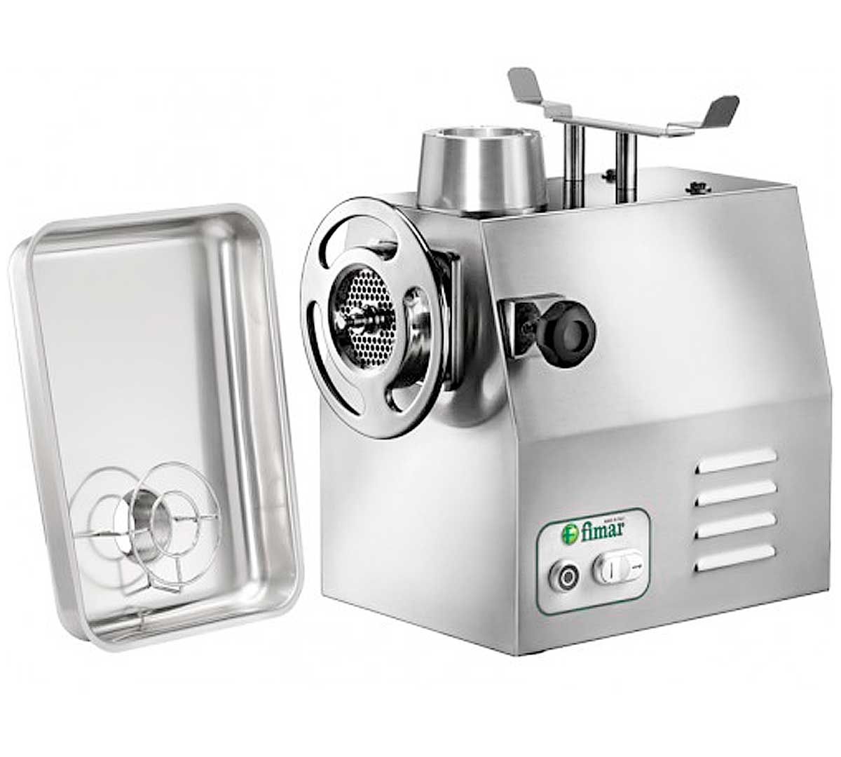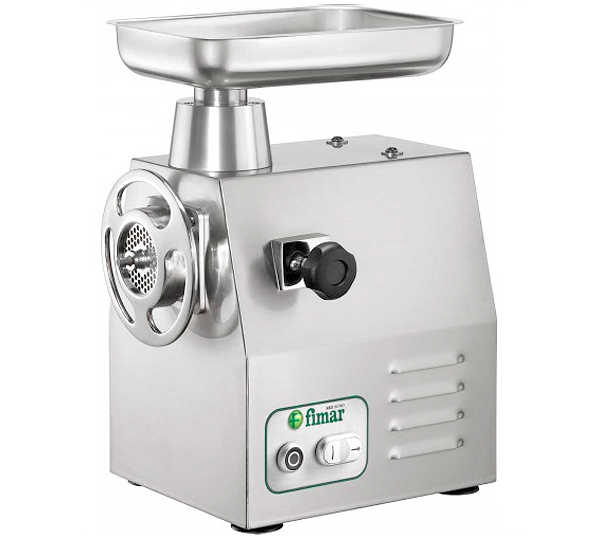 Picadora de carne eléctrica industrial Fimar con cuerpo de acero inoxidable, motor ventilado y boca de entrada de 82 mm. Diseñada para uso comercial de alto volumen.
